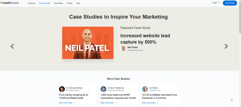 דוגמה נוספת: חברת leadquizzes שמספקת פלטפורמה לחידונים ולסקרים לאתרים יצרו דף עם כל חקר המקרים שלהם והפכו אותו לבולט במיוחד, הדף נמצא למעלה ליד הלוגו שלהם ולא ניתן לפספס אותו.